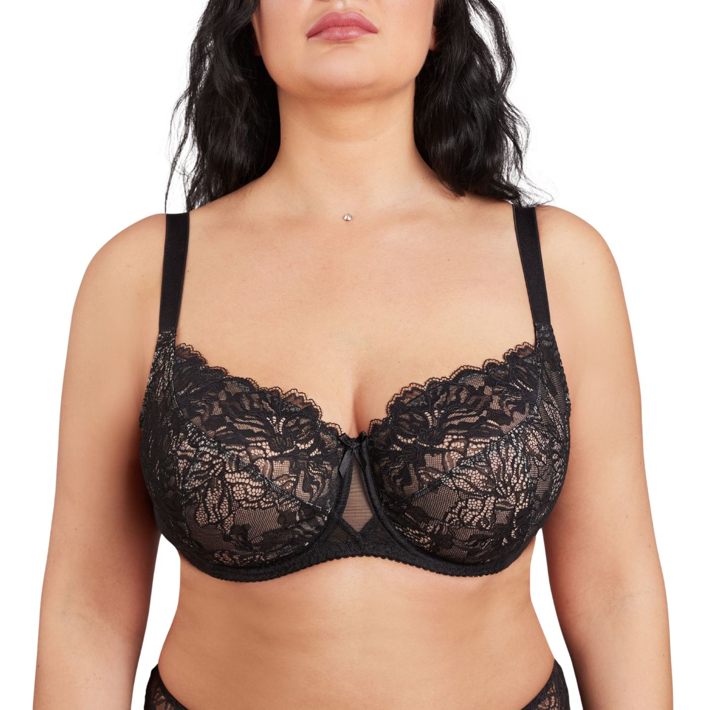 Бюстгальтер выполнен из эффектного жаккардового полотна, эластичного кружева и эластичного трикотажа.