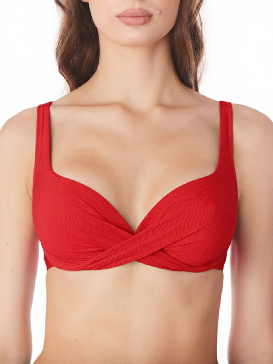 Купальный бюстгальтер с мягкими чашками на каркасах обеспечивает надежную поддержку груди и подчеркивает ее естественную красивую форму без добавления лишнего объема. Бретели регулируются по высоте, а также удобно отстегиваются на спине для получения ровного и красивого загара без полосок. Модель выполнена из однотонного купального жаккардового полотна с декором в виде перекрута.